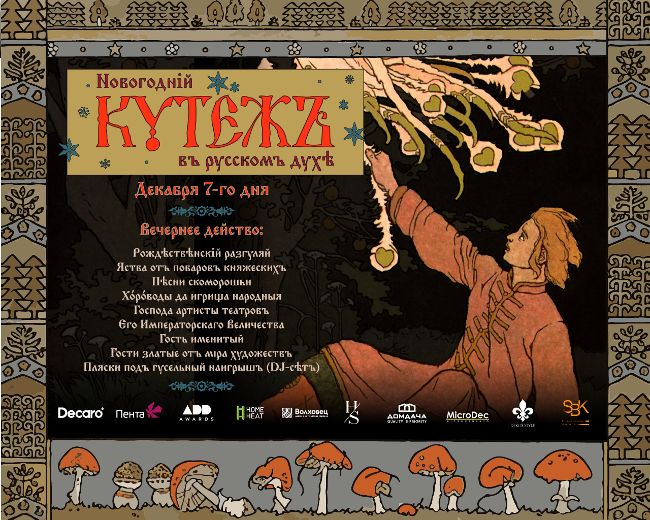 Новогоднiй кутёжъ въ русскомъ духѣ будет 7 декабря на шикарной площадке ресторана «Весенний». Сбор гостей в 16:30, окончание кутежа в полночь. С нами этот праздник разделят VIP-гости из Москвы: Александр Батеньков и Павел Алексеев.