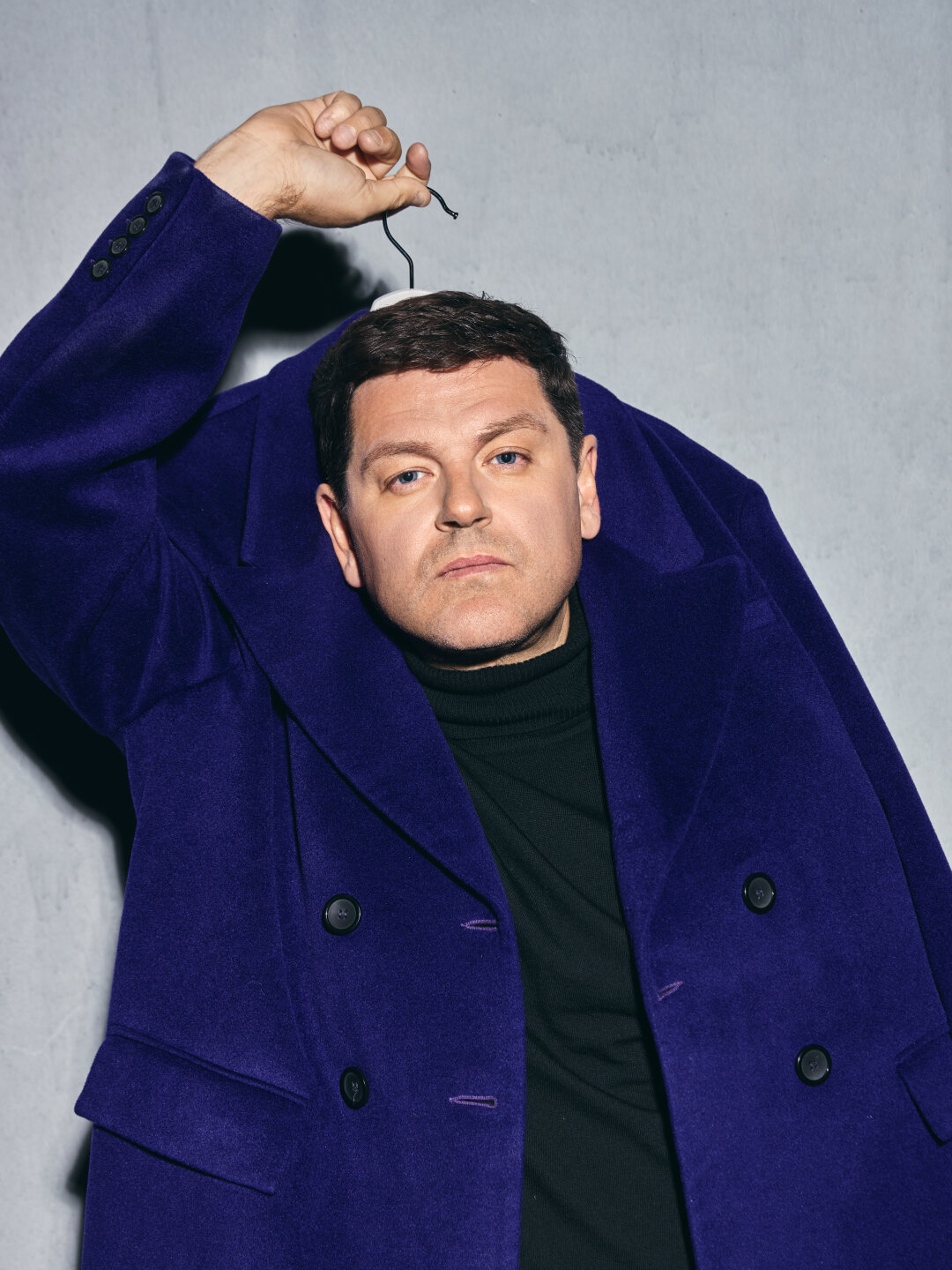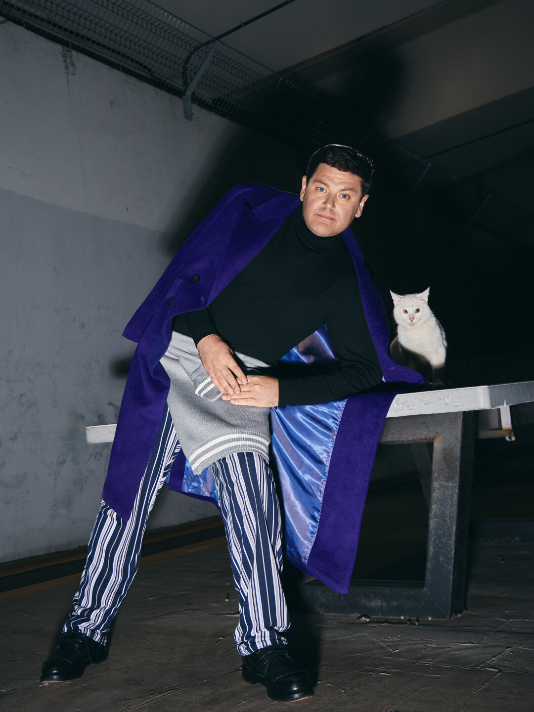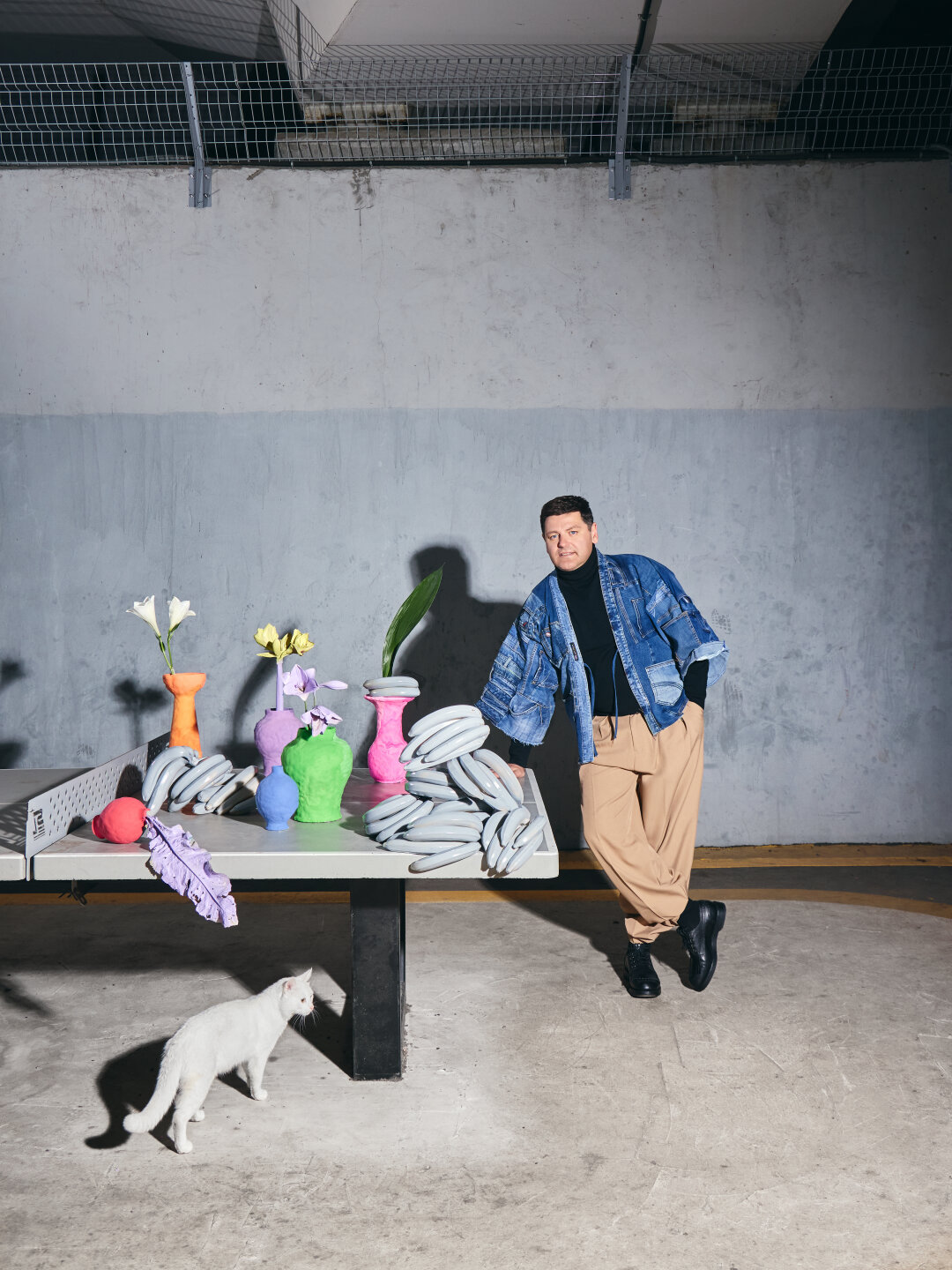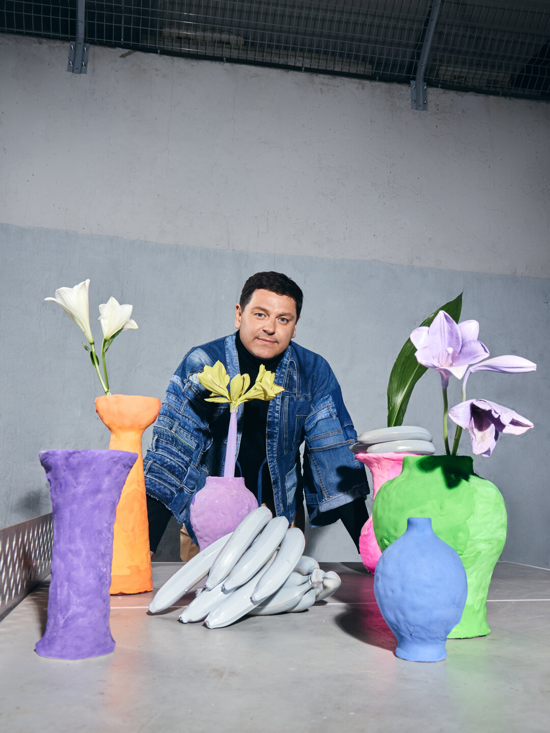 Тотал блэк отменяется! Для фотосета Алексею Леонтьевскому придумали луки в стиле продвинутого арт-дилера: кимоно из денима, пальто цвета «синий Ива Кляйна» (недавняя сенсация Christie's) и брюки в полоску (девяностые снова в тренде). Сет-дизайнер Валерия Лакруа покрыла пластилином винтажные голландские вазы середины прошлого века, а лилии и амариллисы покрасила им в тон.